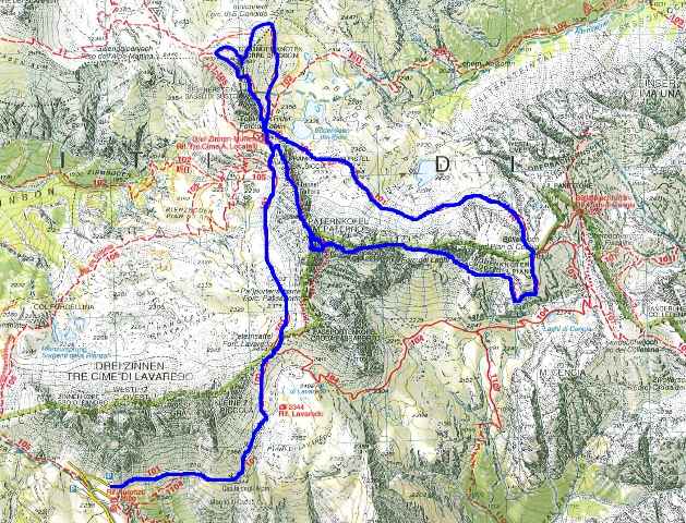 Nachdem wir am Montag Vormittag Teestunde hatten, und nicht auf die Berge kamen, hatten wir die beiden Montag-Ziele am Donnerstag nachgeholt. Auffahrt zum Rif. Auronzo, dann über den Paternsattel zur 3-Zinnen-Hütte. Von dort über den Innerkoflersteig auf den Paternkofel auf 2740m. Über den Schartenweg bis zum Büllelejoch. Von dort zurück zum Toblinger Knoten. Über den Leiternsteig auf den Gipfel auf 2617m, den Ostgrad wieder zurück über den Paternsattel zum Auto. Wunderschöne, anstrengende und nervenkitzelige Runde - die 3-Zinnen-Highlights in einem Aufwischen.