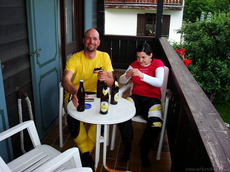 Am Samstag kam dann die Verstärkung nach: Doris und Heli verstauten noch schnell ihre beiden Kids bei den Großeltern und machten sich auf den Weg zum vereinbarten Treffpunkt im Murtal. Nachdem in Kärnten das Wetter "ennstalerisch" war, hatten wir kurzerhand beschlossen Richtung Norden zu fahren. So ging es quer durch Salzburg wieder nach Deutschland. Am Donnerstag hatten wir die nette Ortschaft schon gesehen: Reit im Winkel. Wir hatten auch gleich eine ganz nette Pension gefunden: Sonnenhang. Zuerst gab's am Balkon ein (oder mehrere) gemütliche Ankunftsbier, und dann im Ort die einheimische Spezialität "Bayrischer Wurstsalat"