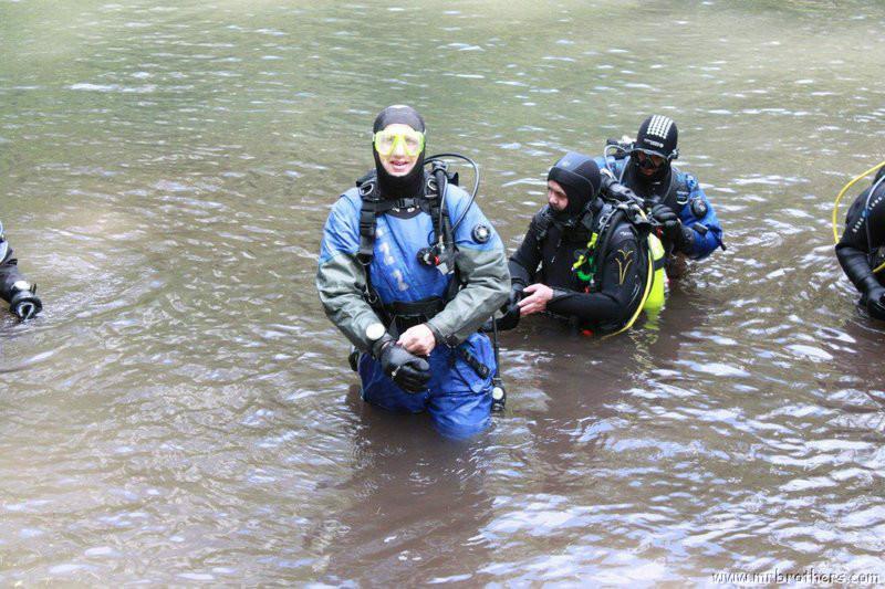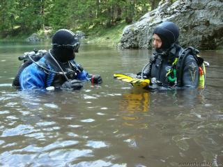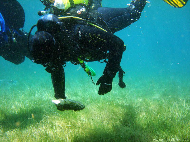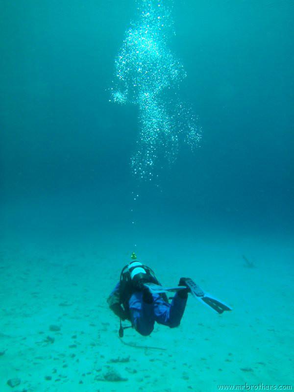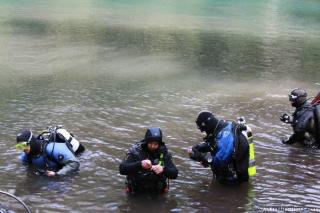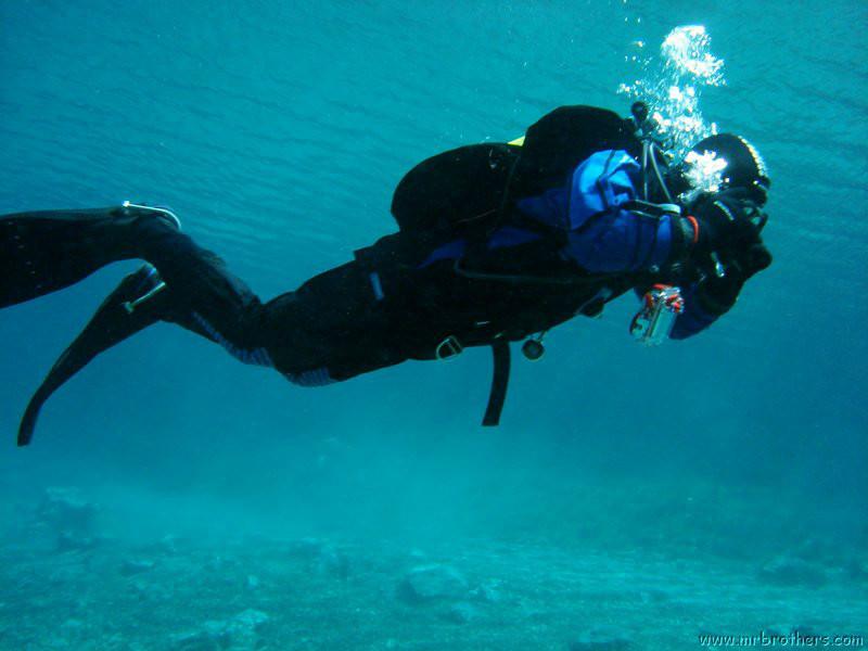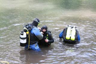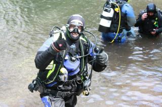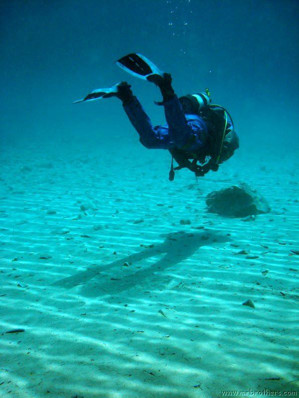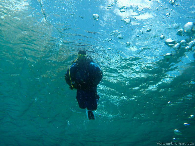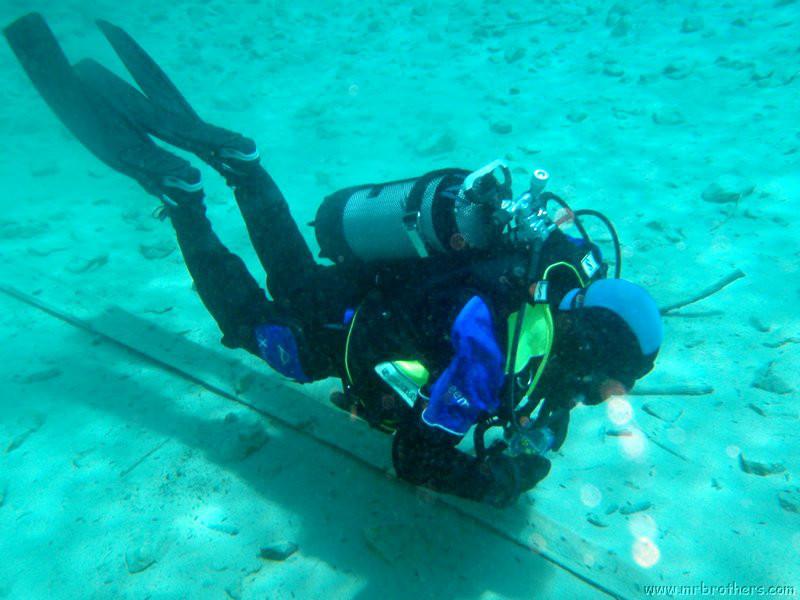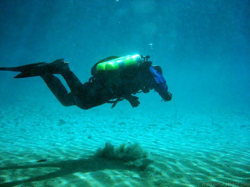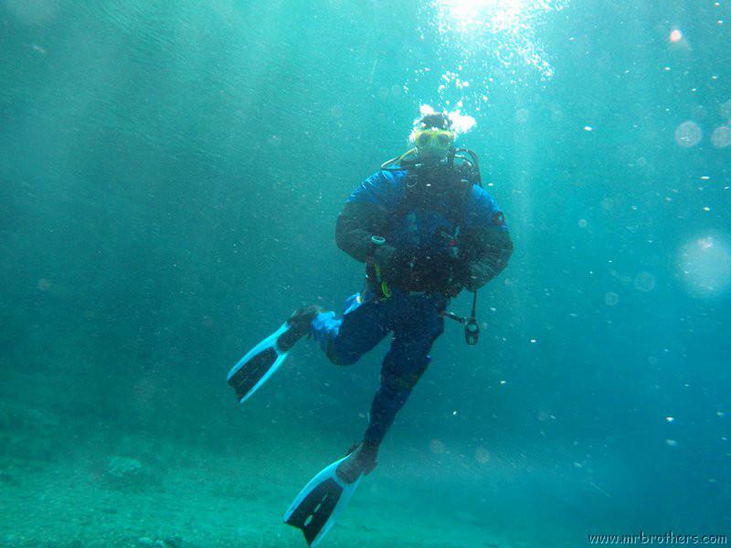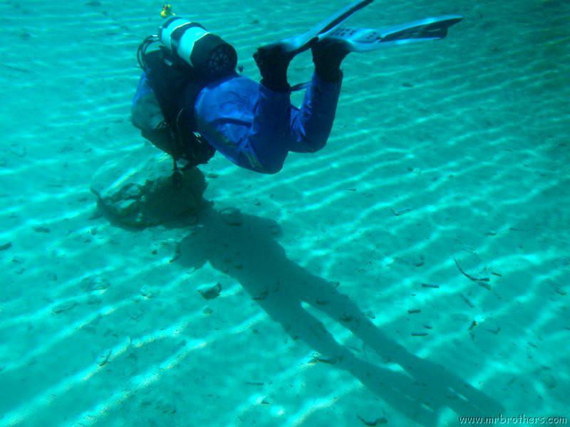 Nachdem wir uns so halbwegs akklimatisiert hatten, und alle diverse Bleimängel mit Steinen ausgeglichen hatten, ging der erste Tauchgang links rüber zur überschwemmten Brücke. Ein kleiner Zwischenstopp musste jedoch eingelegt werden, damit Martin seinen Wassereinbruch im Handschuh beheben konnte. Man sieht die fehlende Übung...
