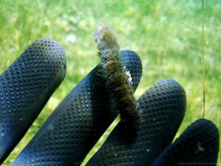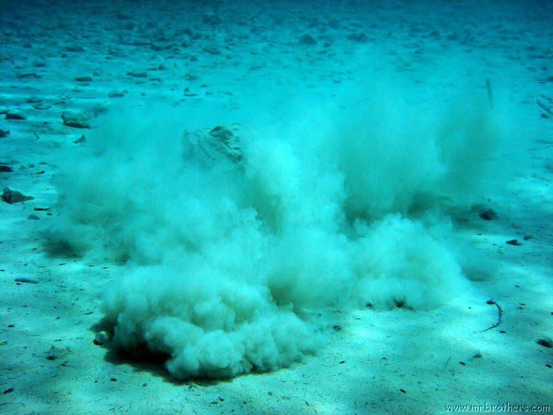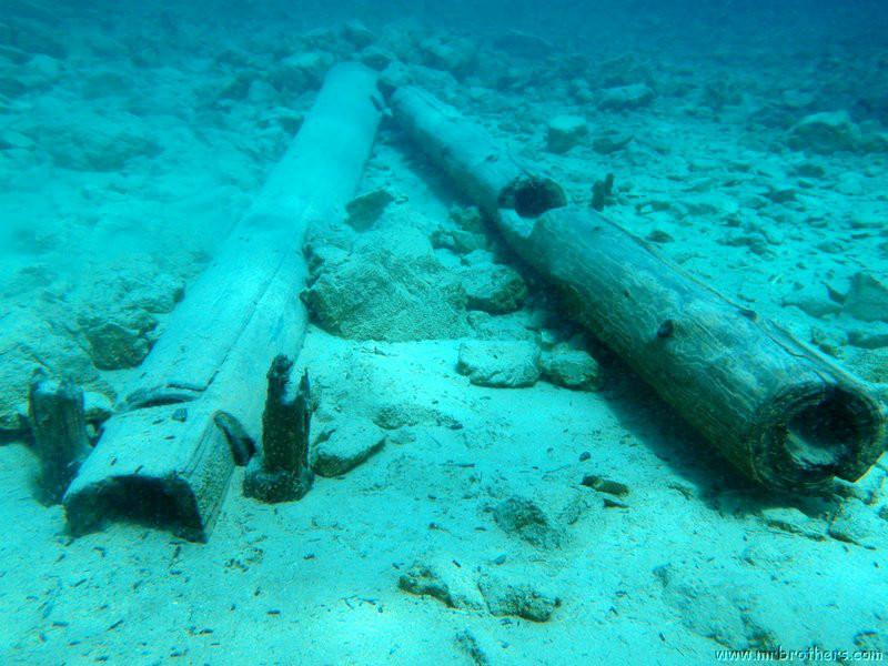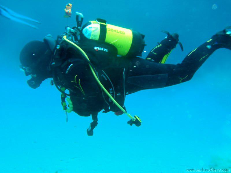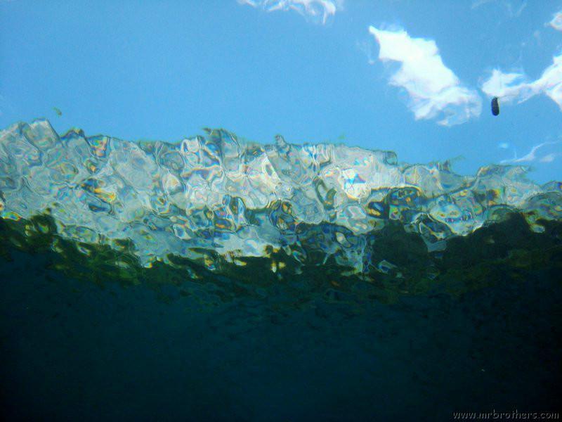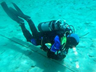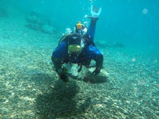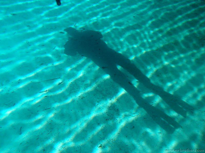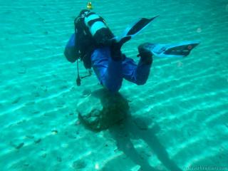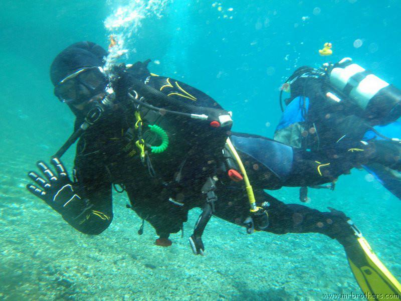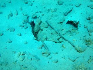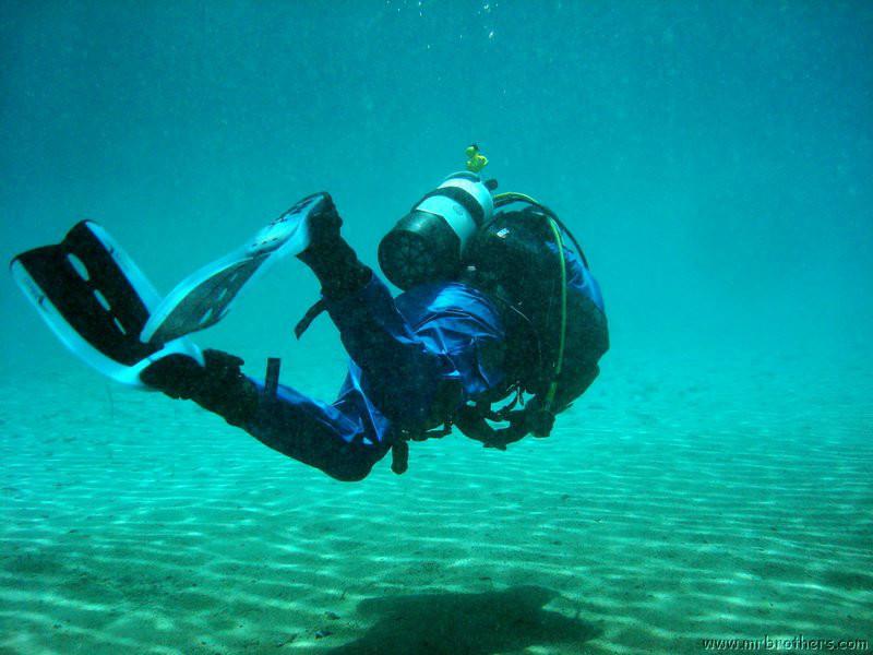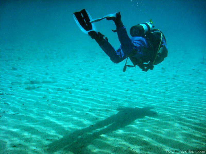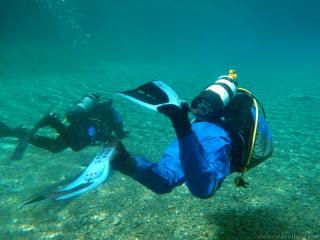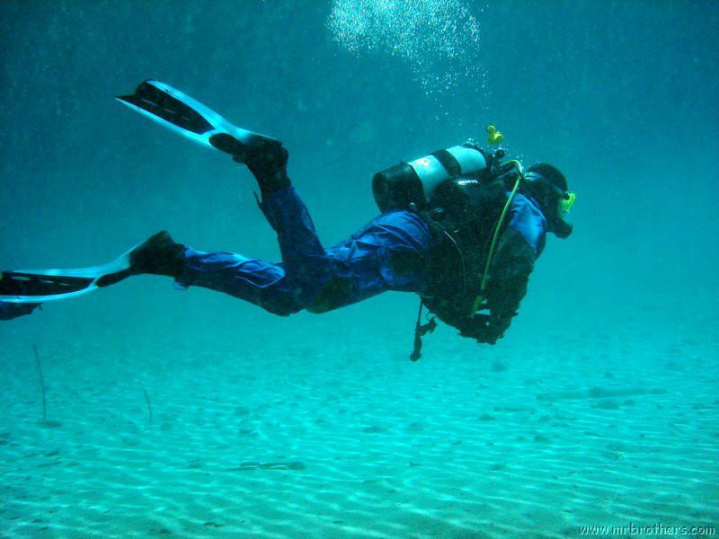 Nachdem wir uns so halbwegs akklimatisiert hatten, und alle diverse Bleimängel mit Steinen ausgeglichen hatten, ging der erste Tauchgang links rüber zur überschwemmten Brücke. Ein kleiner Zwischenstopp musste jedoch eingelegt werden, damit Martin seinen Wassereinbruch im Handschuh beheben konnte. Man sieht die fehlende Übung...