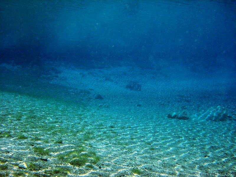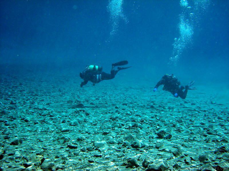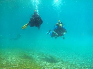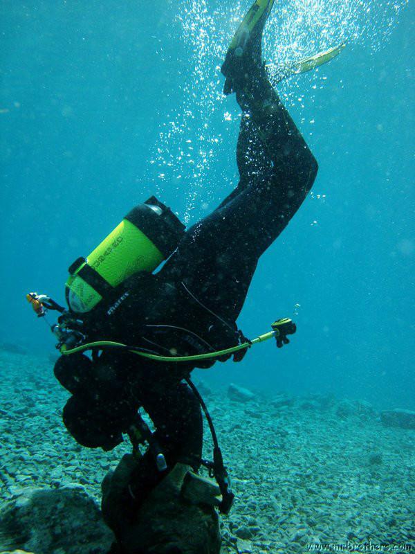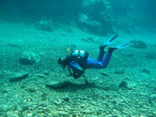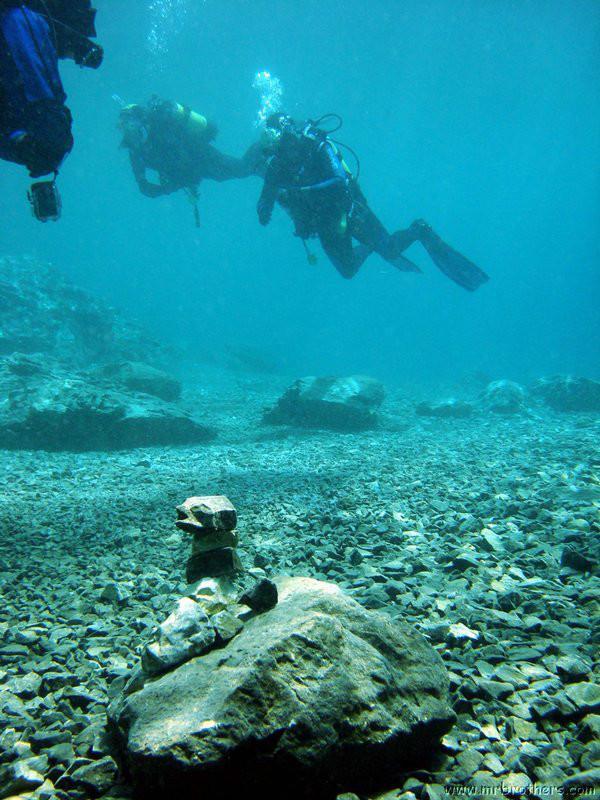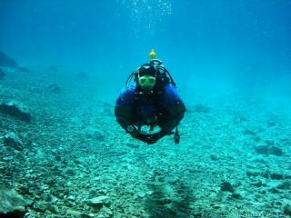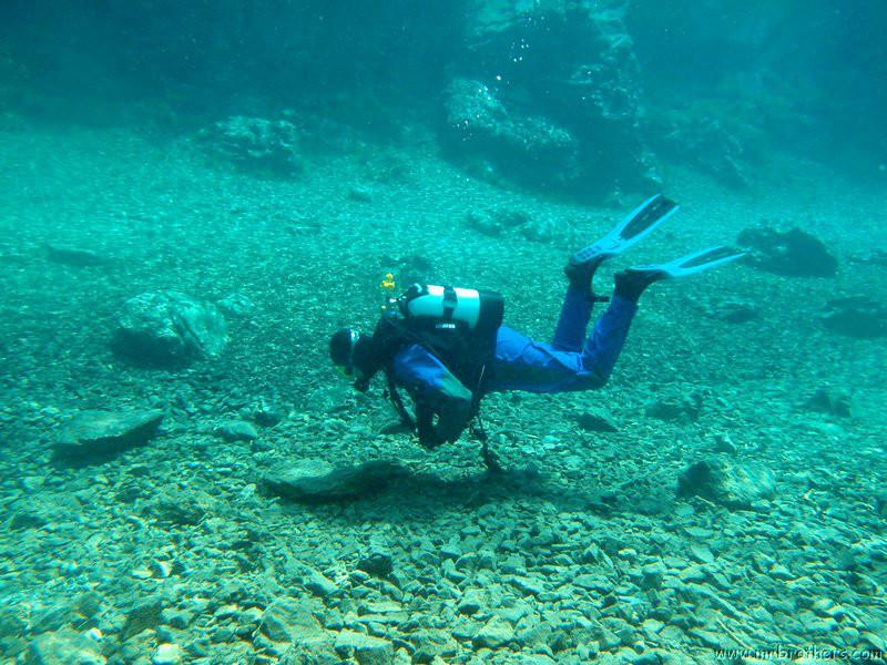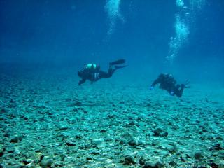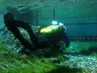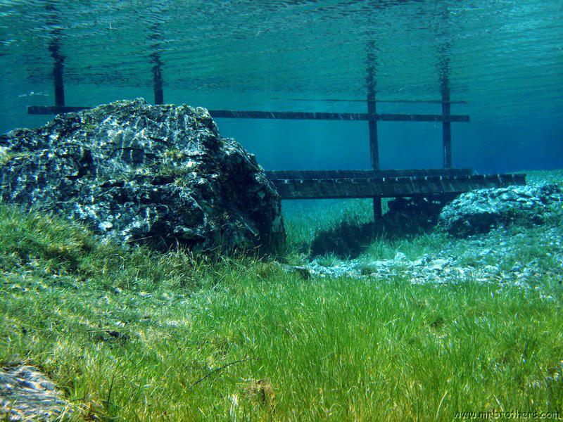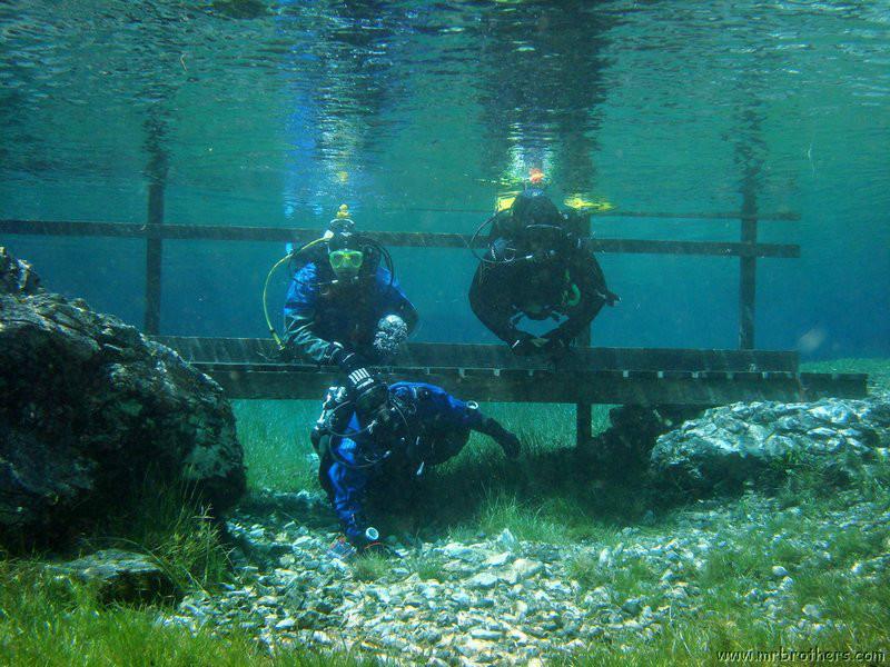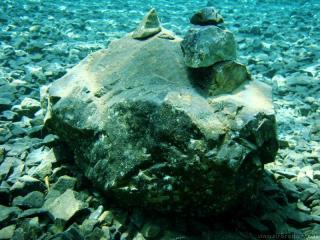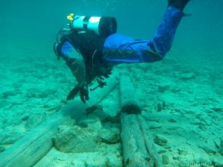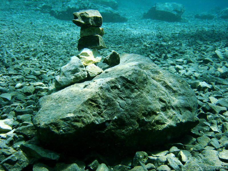Nach einer kurzen Pause, machten wir dann noch einen zweiten Tauchgang rechts rüber zur tiefsten Stelle des Sees. Viel bessere Sicht, und bei Weitem nicht mehr so viele Taucher. Nach ein paar Quelltöpfen, und nach der alten Holz-Wasserleitung (?) drehten wir dann über die tiefste Stelle im See (7,3m) zurück, und tauchten wieder zur Einstiegstelle. Ganz nett für alle, die Schwierigkeiten beim Navigieren haben, dass ein paar Steinmänner den Weg zur Einstiegstelle weisen.