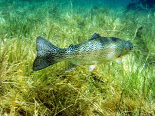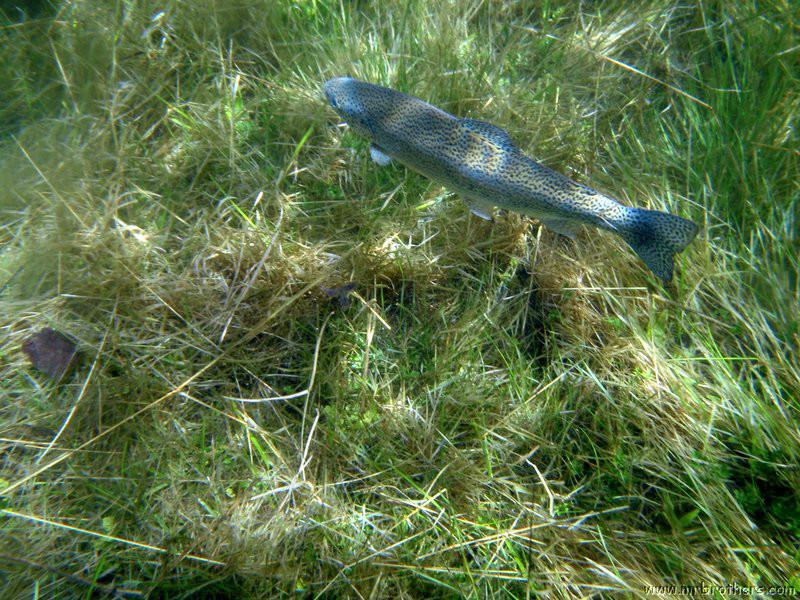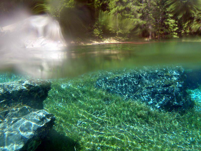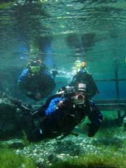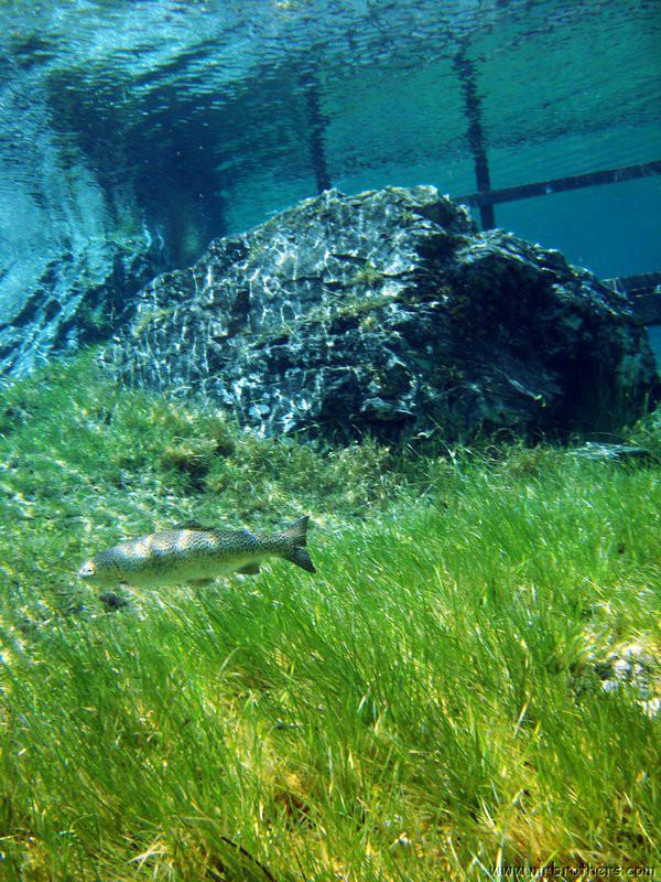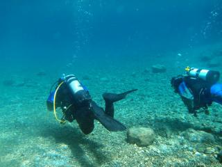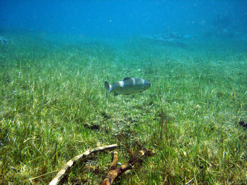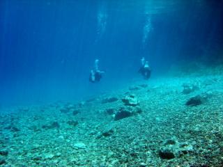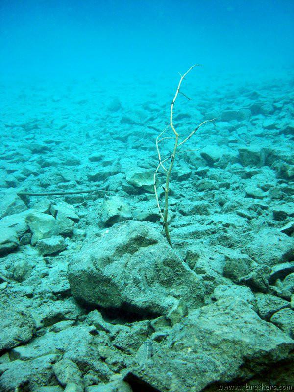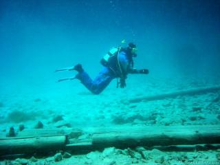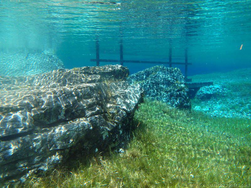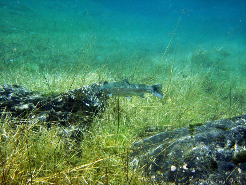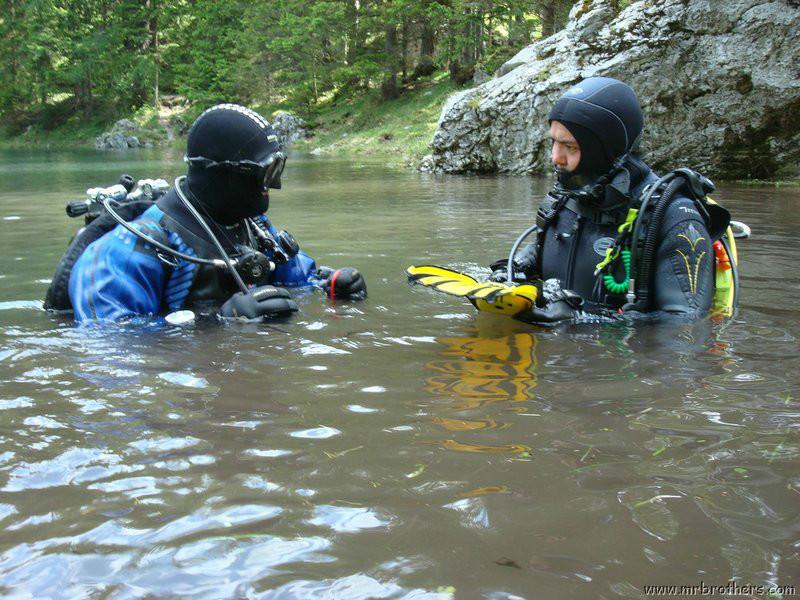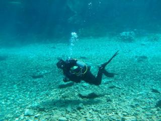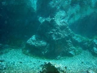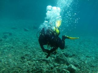 Nach einer kurzen Pause, machten wir dann noch einen zweiten Tauchgang rechts rüber zur tiefsten Stelle des Sees. Viel bessere Sicht, und bei Weitem nicht mehr so viele Taucher. Nach ein paar Quelltöpfen, und nach der alten Holz-Wasserleitung (?) drehten wir dann über die tiefste Stelle im See (7,3m) zurück, und tauchten wieder zur Einstiegstelle. Ganz nett für alle, die Schwierigkeiten beim Navigieren haben, dass ein paar Steinmänner den Weg zur Einstiegstelle weisen.