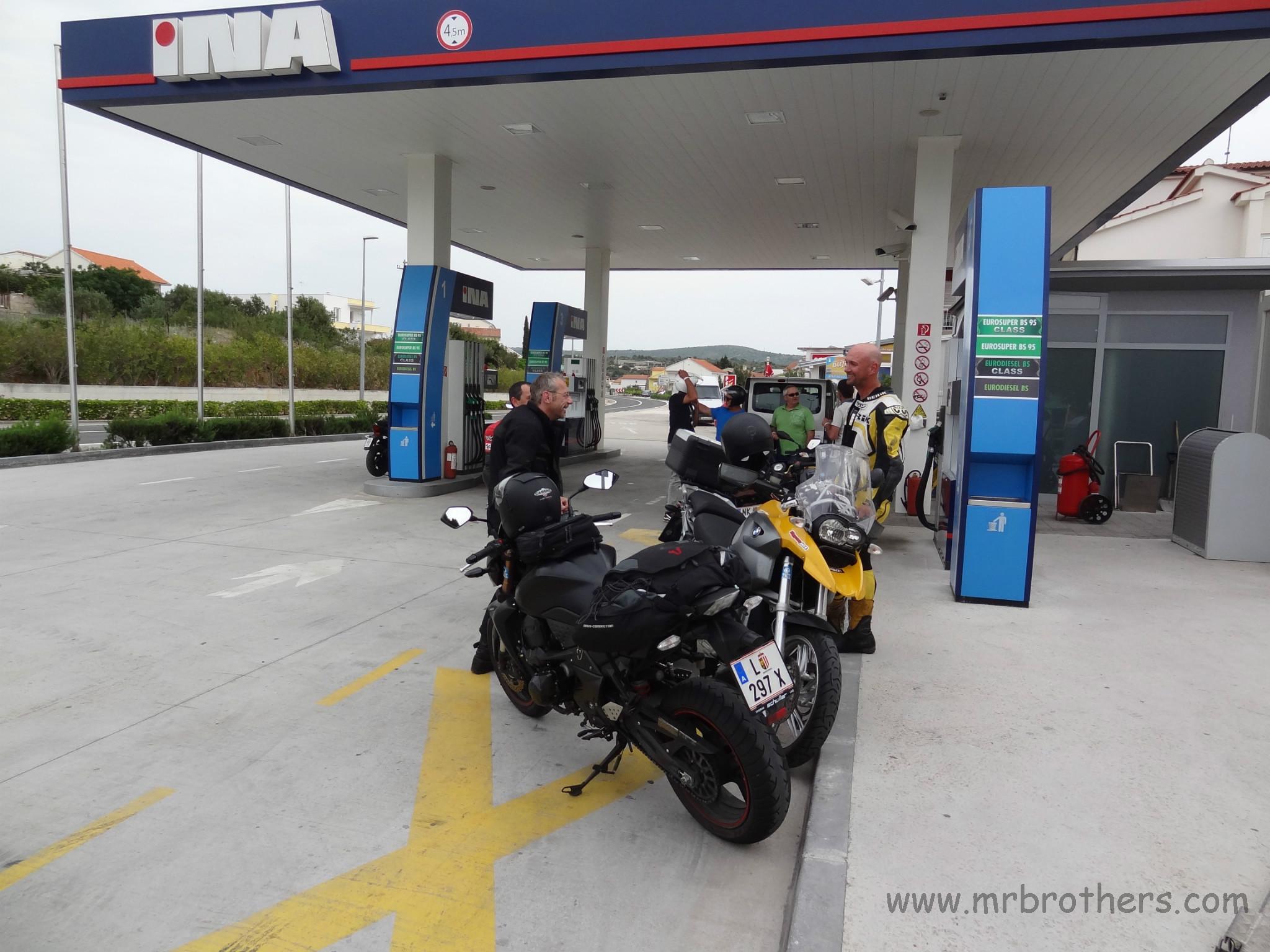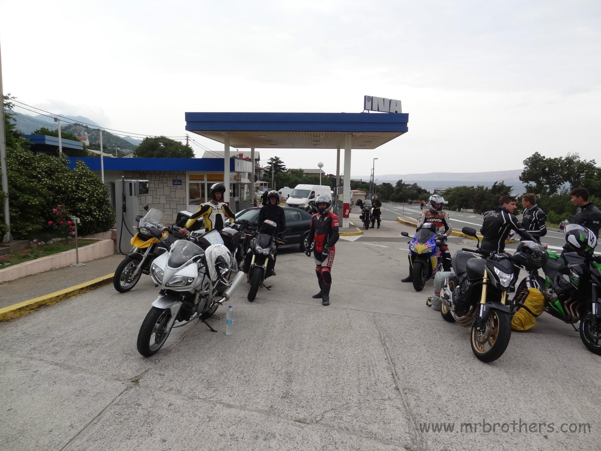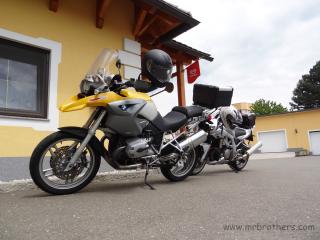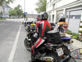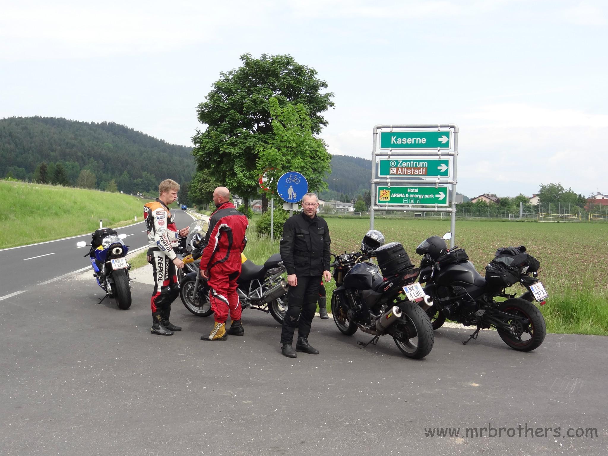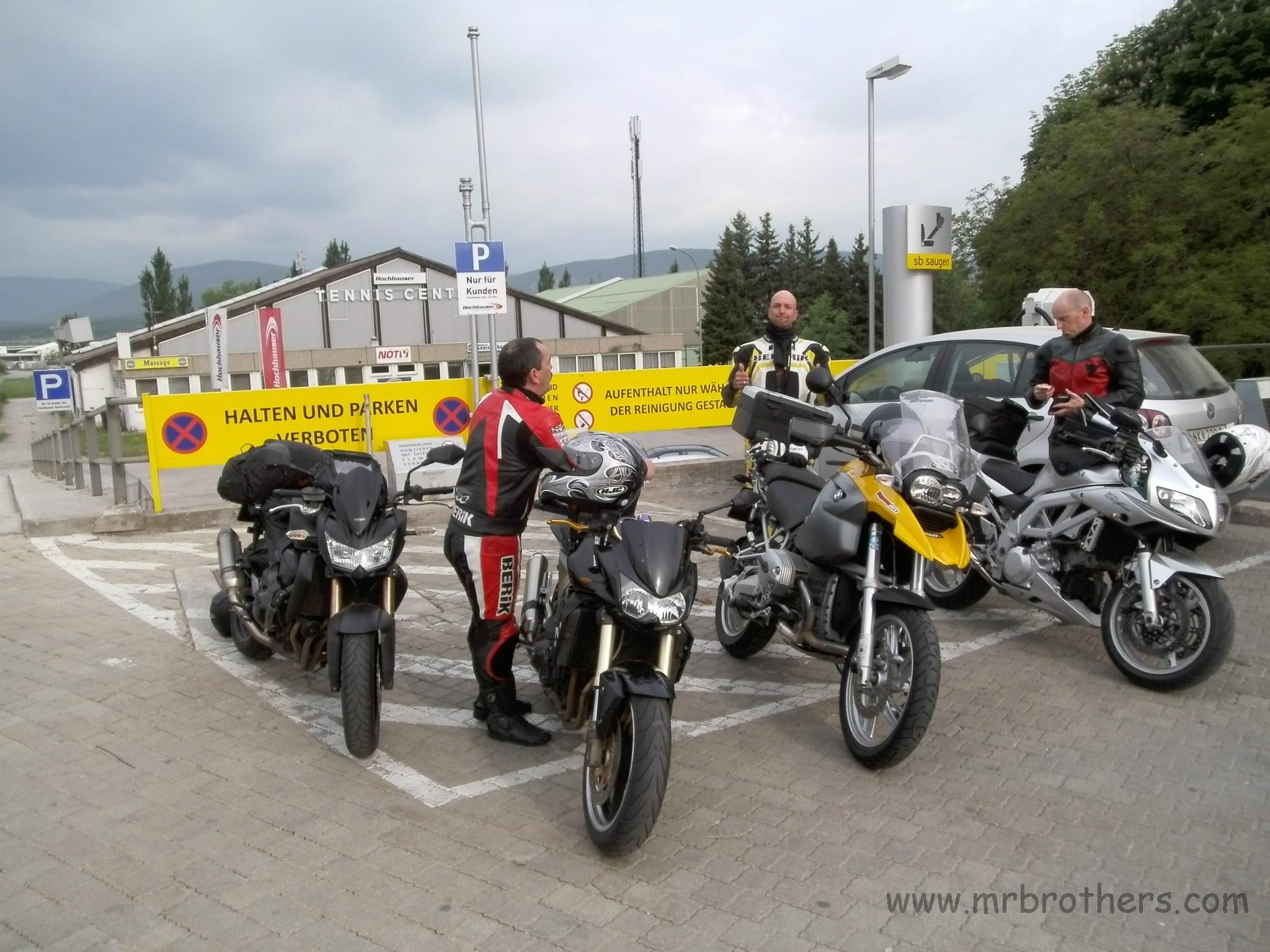Treffpunkt war, wie üblich, die Tankstelle in Neunkirchen. Nach anfänglichen Diskussionen über das Wetter, die Temperatur, den Termin, Autobahn ja/nein, ... , ging es dann endlich los Richtung Süden. Erschreckend sind die Tabubrüche, die es immer wieder auf unseren Touren gibt: vor einigen Jahren die ersten Seitentaschen, dann der erste Duttlbär, dann die Vermehrung der Griffheizungen, dann das erste Top-Case , ... und heuer hatten wir das erste mal mehr Medikamente mit als manch anderer T-Shirts ...