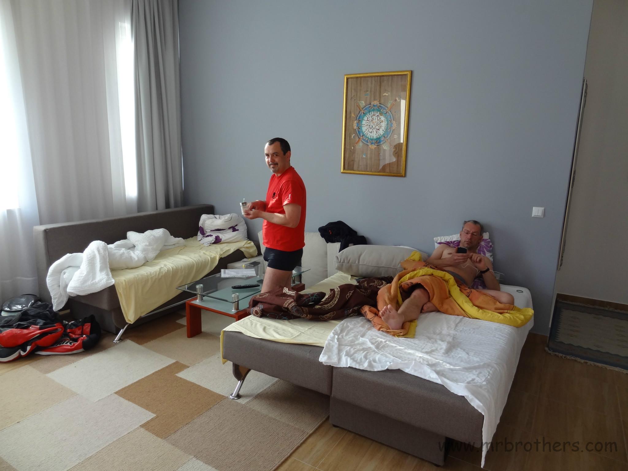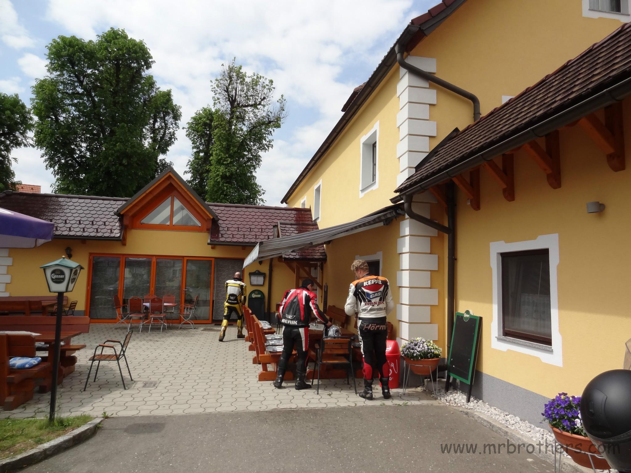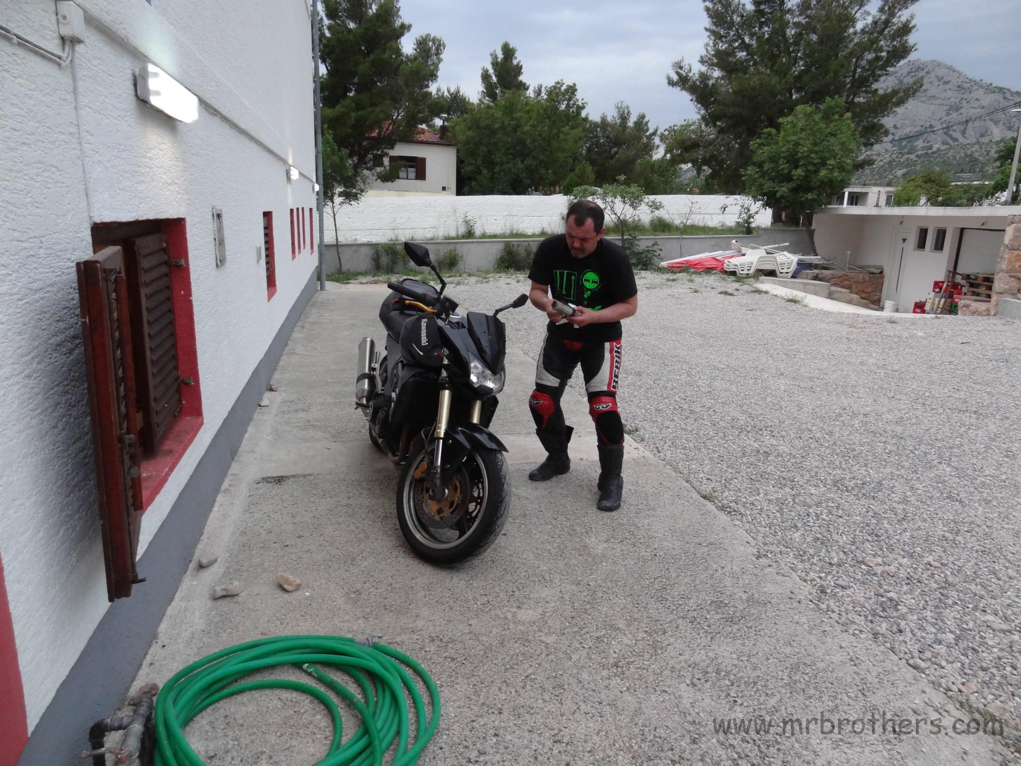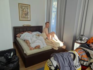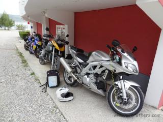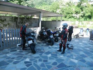 Unser Nachtquartier war solalla ... bei uns war die Dusche und's WC am Balkon ... aber grundsätzlich ok. Für die "Z" war dieser Morgen jedoch ein unüblicher Morgen: es war notwendig ihr mit Imbus- und Gabelschlüssel zu Leibe zu rücken, eine Schraube der Motoraufhängung war abgebrochen. Wir fanden aber gleich in der Nähe einen "Baumarkt" dessen Besitzer ausgesprochen hilfsbereit war, sodass die "Z" bald wieder einsatzfähig war. Lediglich der Bertl konnte erst mit "Luftunterstützung" in seine Lederkombi "flutschen".