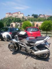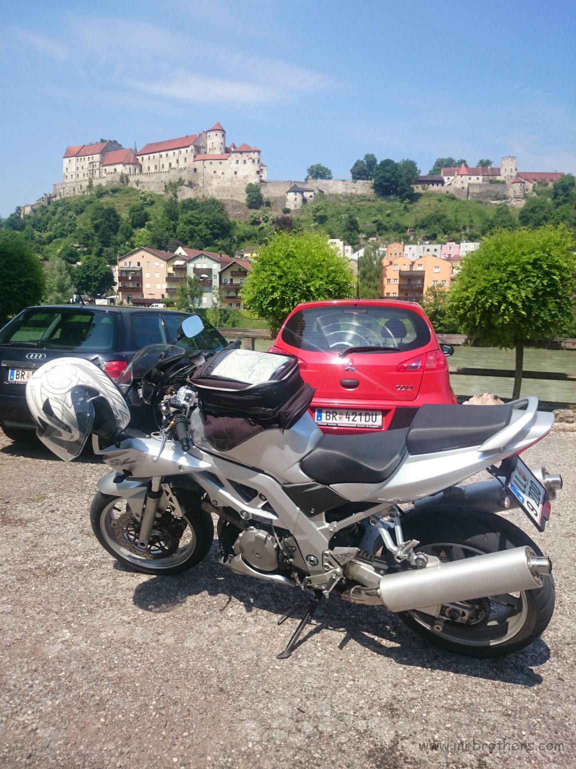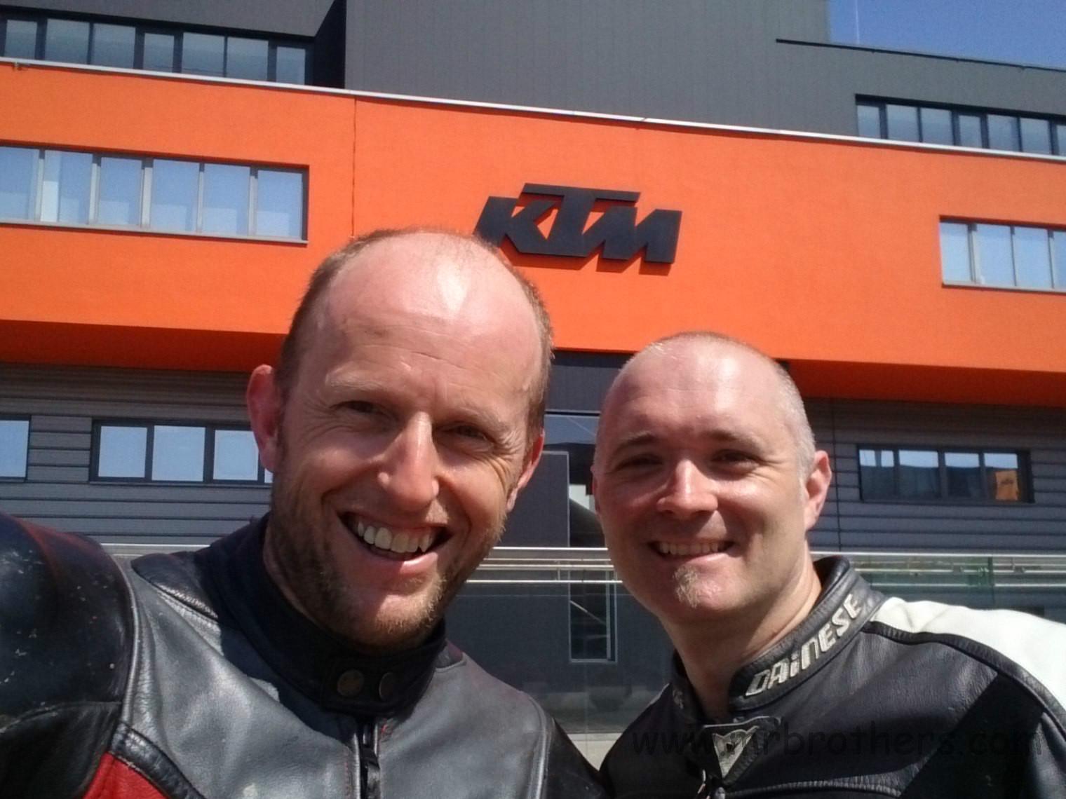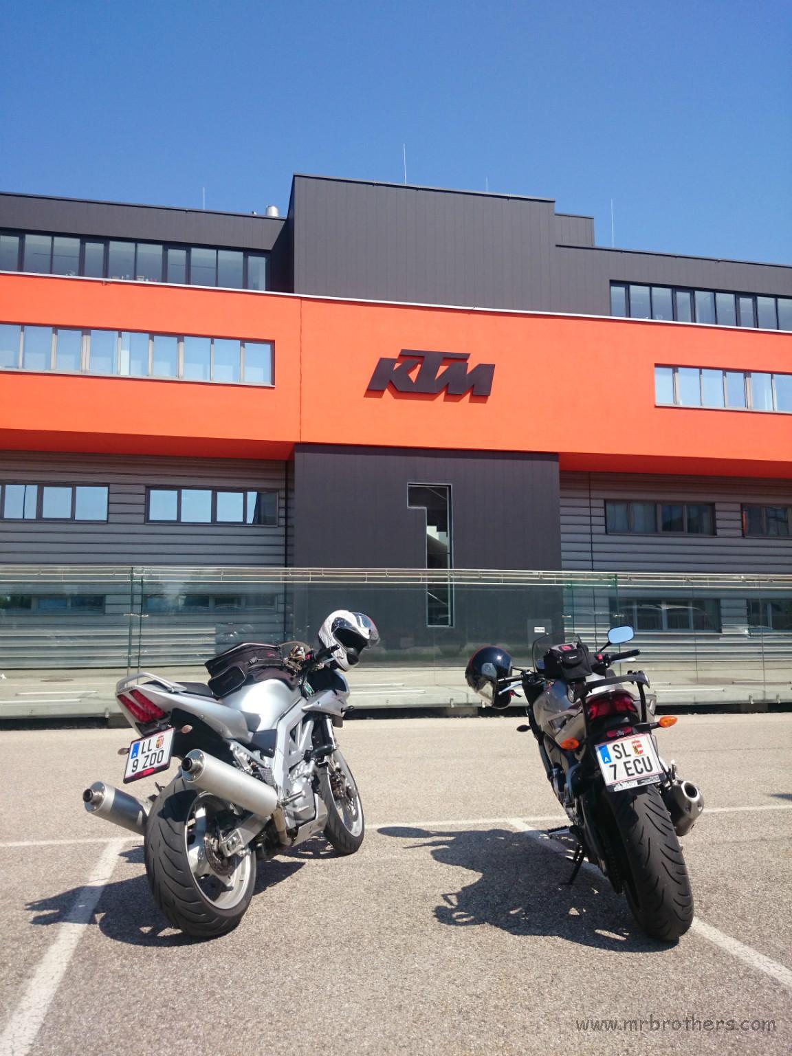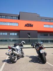 Mike und Martin haben beschlossen eine kleine Runde durchs und ums Innviertel zu drehen. Da bietet es sich ja regelrecht an, mal einen kleine Abstecher ins Mekka der "orangen Glaubensgemeinschaft" zu machen, und eine Runde um deren "Kaaba" zu drehen ... oder besser gesagt, sich mit einer Suzi und einer Yamaha auf den Parkplatz des KTM-Headquarters in Mattighofen zu stellen :-)